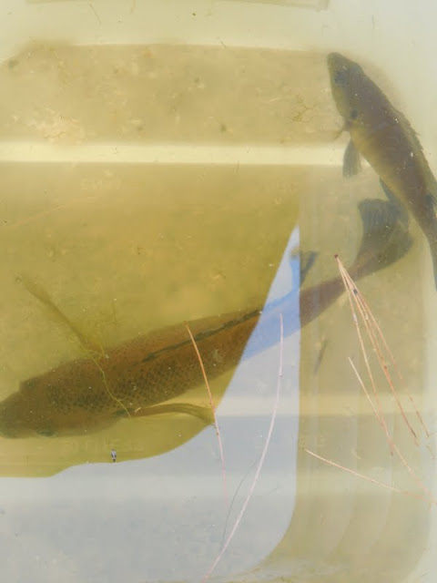 Alec asked me to watch him do the dead man's float yesterday and he really looked like he was dead-- the mom standing next to me remarked about how long he could hold his breath for.  Ian has been fishing-- with bread and a net and had caught a lot of fish!  He tried this off our dock one afternoon while we were feeding the ducks and he caught a few rather large fish as well as some much smaller minnows.  He was so enthralled with this idea that he has spent the last two days teaching everyone else how to do it too.
