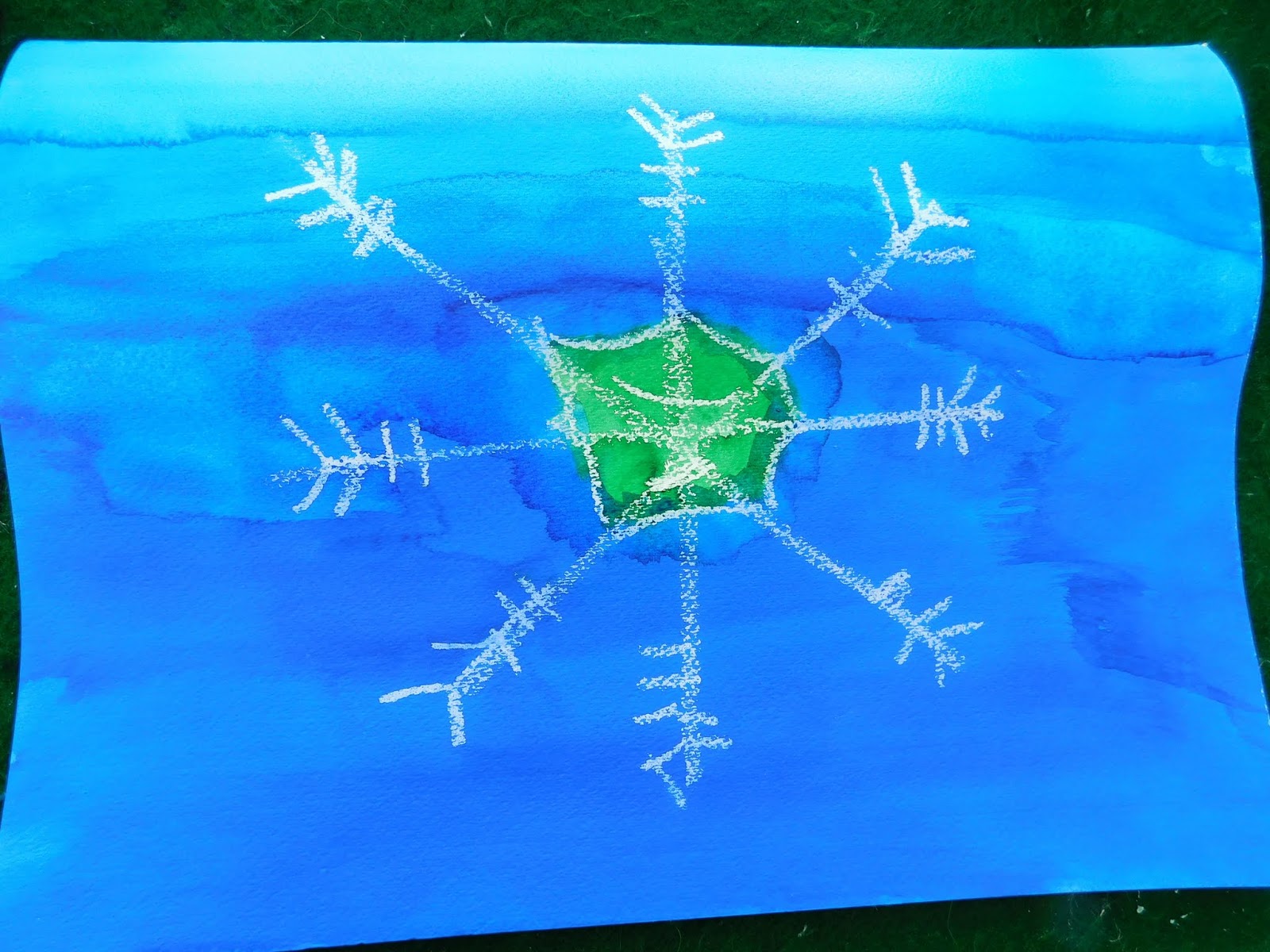 First we drew some snowflakes onto our watercolor paper with white oil pastels; it wasn't always to see the white on white but we knew that if we drew them in pencil first that our lines would show through the pastels and we didn't want that.